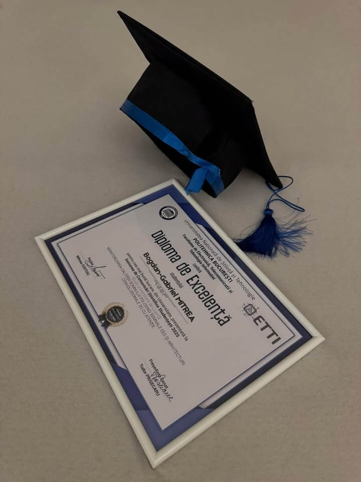 Bogdan Gabriel Mitrea a obținut premiul de excelență pentru cea mai bună lucrare prezentată în Universitate, în acest an. Tema aleasă de el a fost „Monitorizarea calității somnului folosind semnalele EEG și arhitecturi convoluționale 2D cu atenție”.