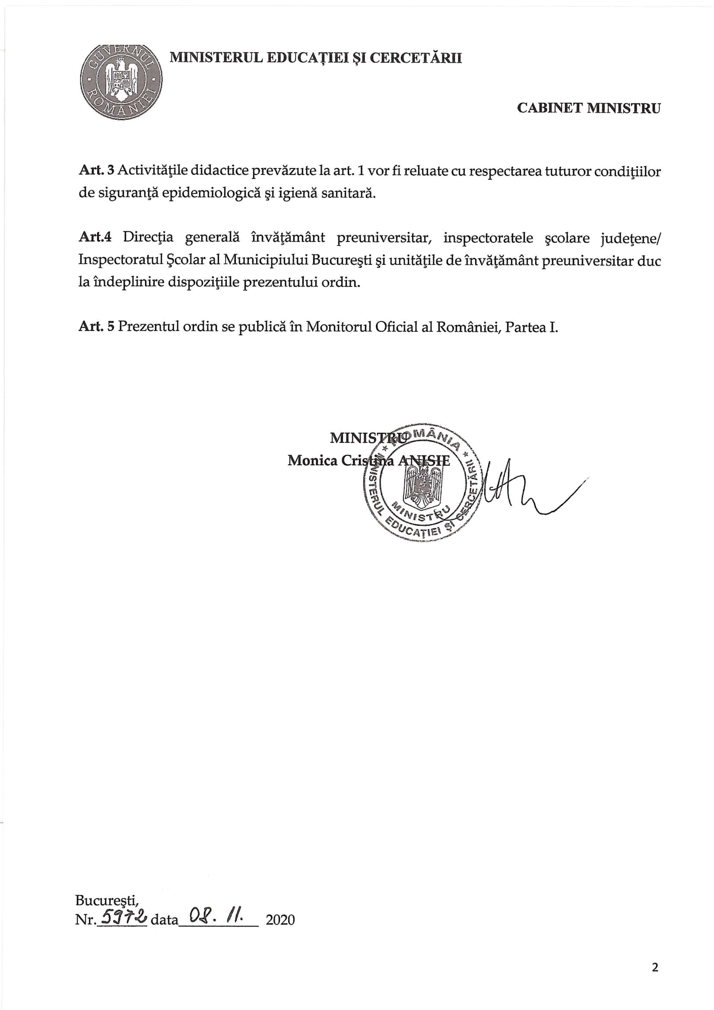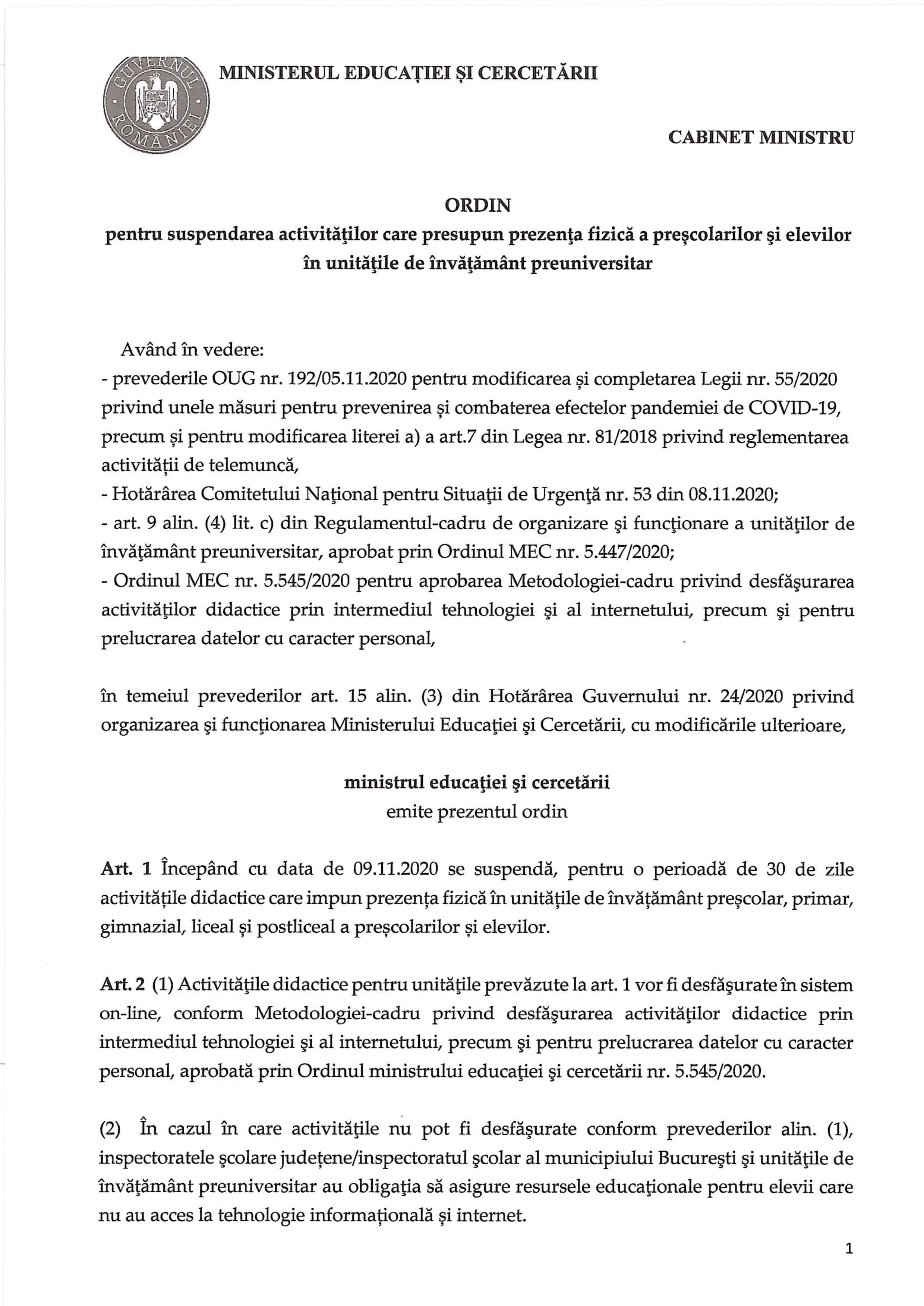 Ministrul Educației, Monica Anisie, a semnat duminică, 8 noiembrie, ordinul care prevede că, "începând cu data de 9.10.2020, se suspendă, pentru o perioadă de 30 de zile, activitățile didactice care impun prezența fizică în unităţile de învăţământ preșcolar, primar, gimnazial, liceal și postliceal a preșcolarilor și elevilor."