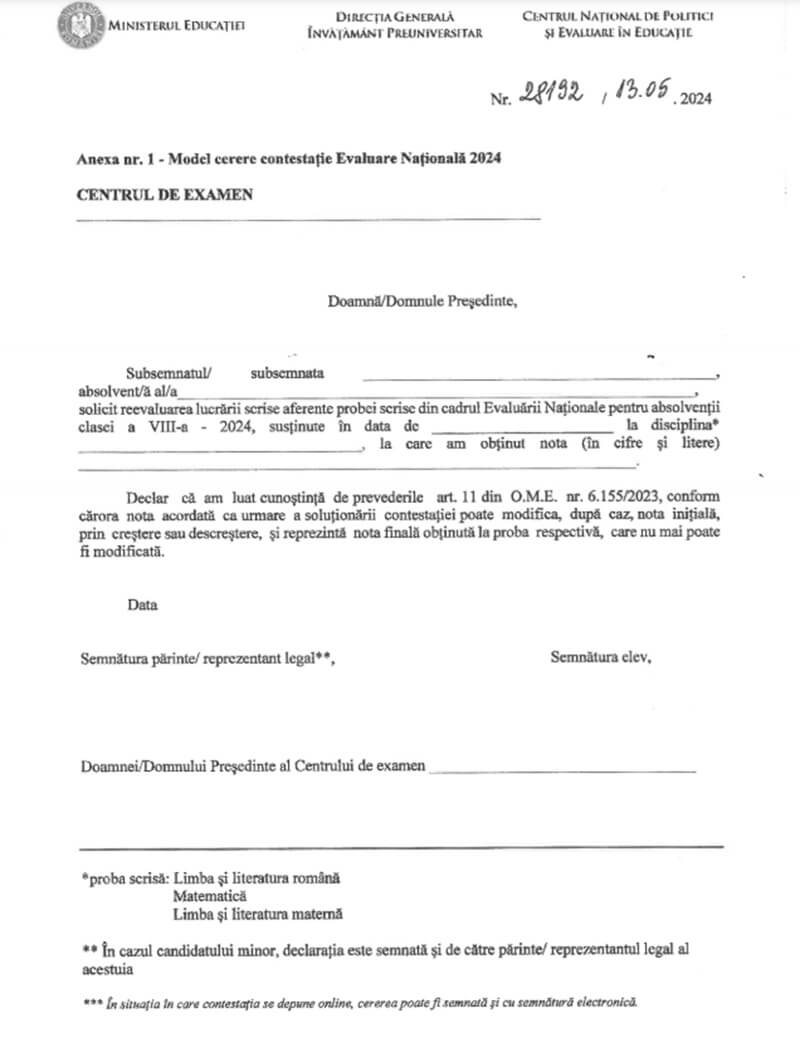 Modelul de cerere - contestație Evaluarea Națională 2024: