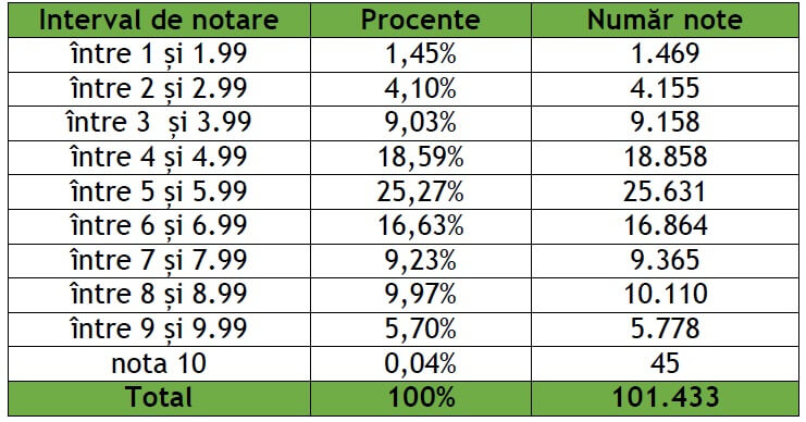 E.a) - Limba și literatura română - 101.433 de lucrări evaluare, din care 67.793 (66,84%) cu note mai mari sau egale cu 5: