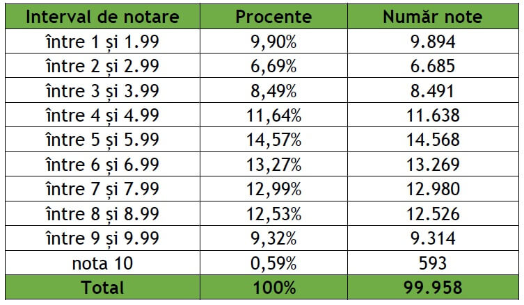Cele peste 300.000 de lucrări au fost corectate, în sistem digitalizat, de aproape 15.000 de profesori evaluatori. Cele mai slabe rezultate au fost înregistrate la proba obligatorie a profilului, iar cele mai puține note de 10 au fost acordate la Limba și literatura română, dacă nu ținem cont de situația testării la Limba maternă, susținute de doar 554 de candidați.