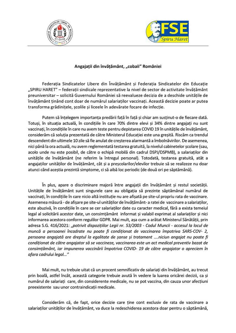 Federația Sindicatelor Libere din Învățământ și Federația Sindicatelor din Educație „SPIRU HARET”  acuză autoritățile că au transformat angajații din școli și grădinițe în „«cobaii» României”, legând reluarea cursurilor față în față de rata de vaccinare a personalului unităților de învățământ și cere revenirea asupra acestei decizii.