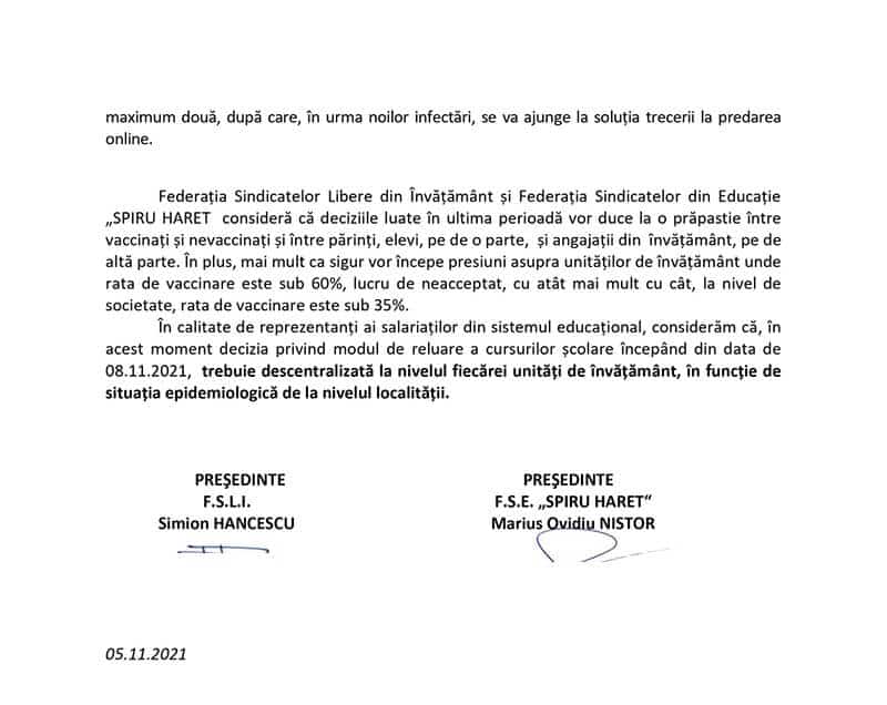 “Putem să înțelegem importanța predării față în față și chiar am susținut-o de fiecare dată. Totuși, în situația actuală, în condițiile în care 70% dintre elevi și 34% dintre angajați nu sunt vaccinați, în condițiile în care nu avem teste pentru depistarea COVID 19 în unitățile de învățământ, considerăm că soluția prezentată de către Ministerul Educației este una greșită. Riscăm ca trendul descendent din ultimele 10 zile să fie anulat de creșterea alarmantă a îmbolnăvirilor. De asemenea, nici până la ora actuală, nu avem reglementată testarea gratuită, la nivelul cabinetelor școlare (sau, acolo unde nu este posibil, de către o echipă mobilă din cadrul DSPJ/DSPMB), a salariaților din unitățile de învățământ (ne referim la întregul personal). Totodată, testarea gratuită, atât a angajaților unităților de învățământ, cât și a preșcolarilor/elevilor trebuie să se realizeze nu doar atunci când aceștia prezintă simptome, ci să aibă loc periodic (de două ori pe săptămână)”, au transmis reprezentanții celor două federații.