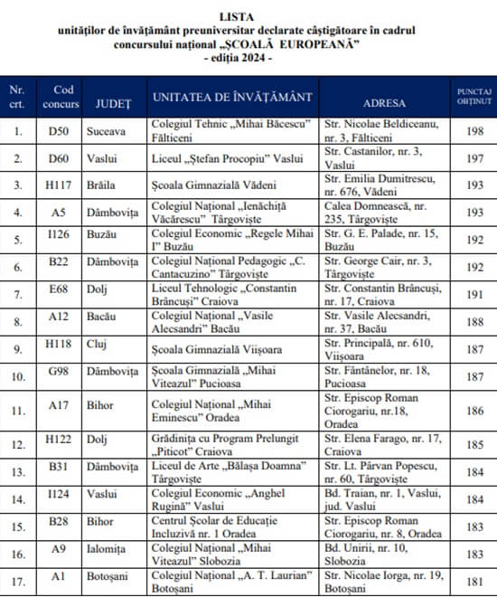 Lista completă a câștigătorilor din 2024, în cadrul competiției „Școală Europeană”: