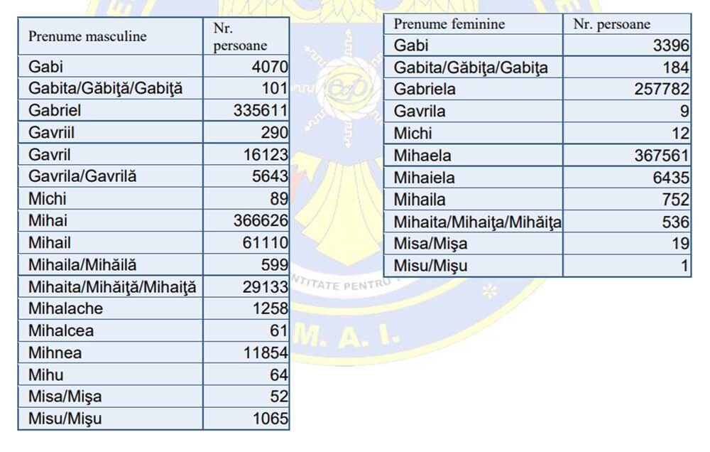 Numele Arhanghelilor Mihail și Gavriil sunt printre cele mai folosite în țara noastră. Prenume derivate din acestea poartă 833.749 de bărbați și 636.687 de femei: