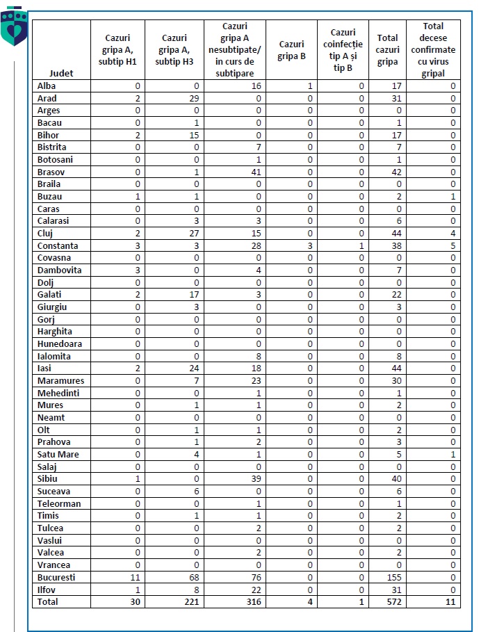 - 174 cazuri de gripă confirmată de laborator (35 cu virus gripal AH3, 5 cu virus gripal AH1, 132 cu virus gripal A nesubtipat, 1 cu virus gripal B și 1 co-infecție de virus gripal A+B), față de față de 104 raportate în săptămâna precedentă