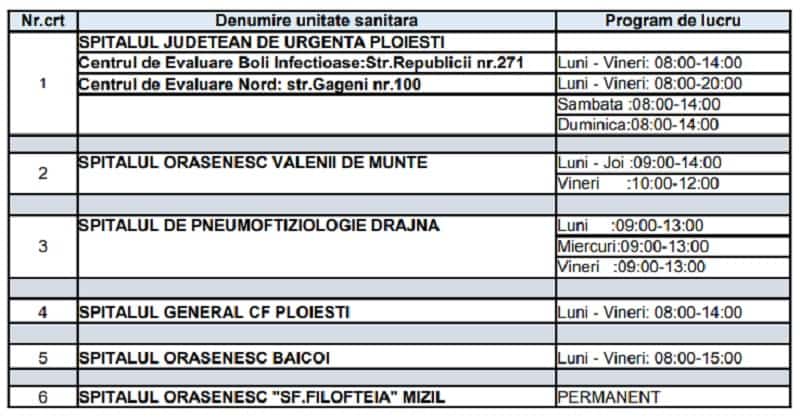 Din cele 10 spitale din județ care și-au exprimat disponibilitatea pentru a organiza centre de evaluare a pacienților Covid, șase vor și deschide, deocamdată, astfel de cabinete. Este vorba despre unități sanitare din Ploiești, Vălenii de Munte, Drajna, Băicoi și Mizil: