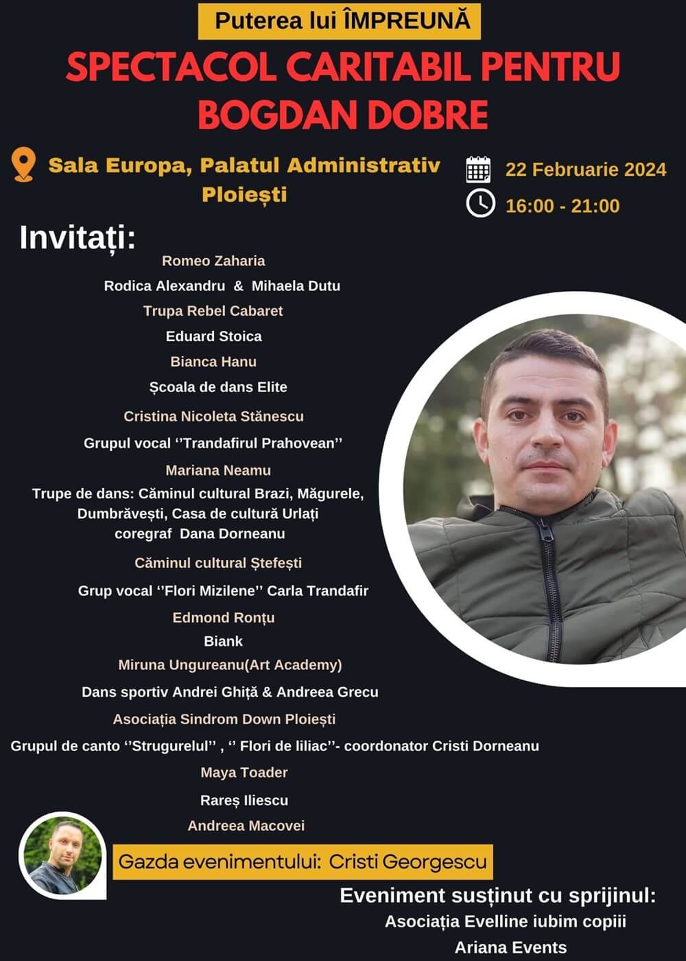 Bogdan este foarte bine în urma operației pe creier, dar în continuare are nevoie de sprijin financiar! Mai sunt multe de făcut... Așadar, împreună cu oameni de bine și artiști săritori din Ploiești și împrejurimi, vom face un spectacol caritabil pentru Bogdan pe 22 februarie, între orele 16:00 - 21:00 la Sala Europa a Palatului Administrativ Ploiești.