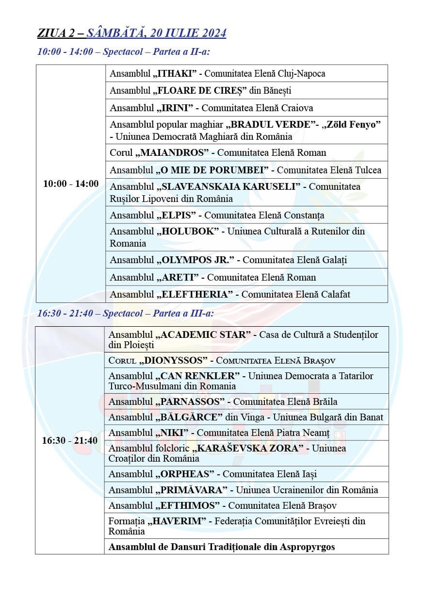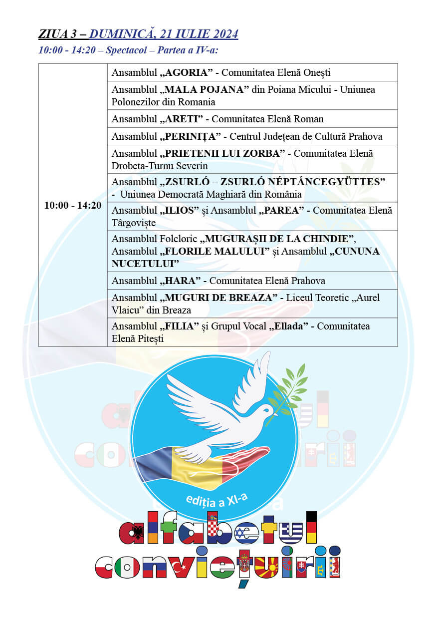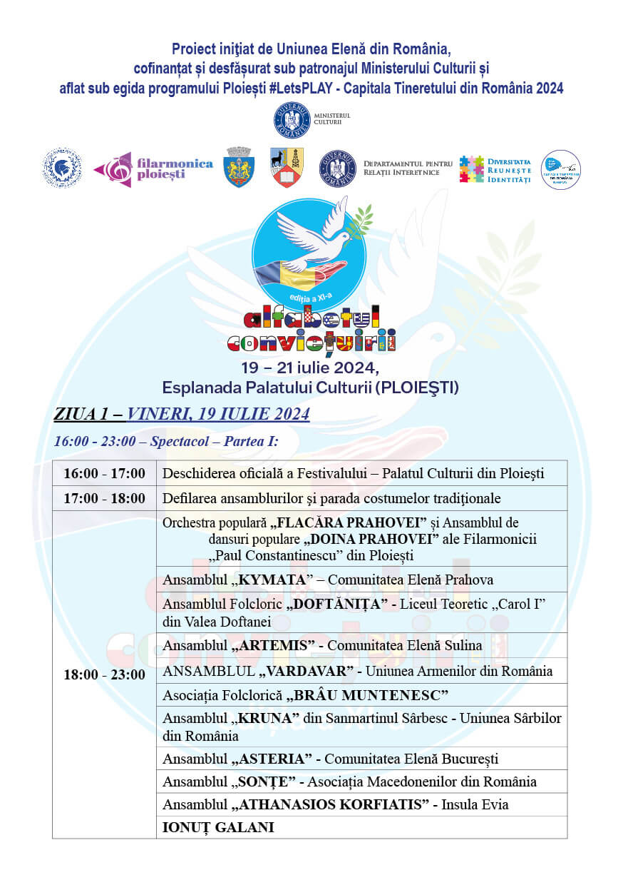 Uniunea Elenă din România invită publicul interesat la ediţia a XI-a a Festivalului Minorităţilor, Alfabetul Convieţuirii, între 19-21 iulie, în faţa Palatului Culturii din Ploieşti. Programul celor 3 zile de festival.
