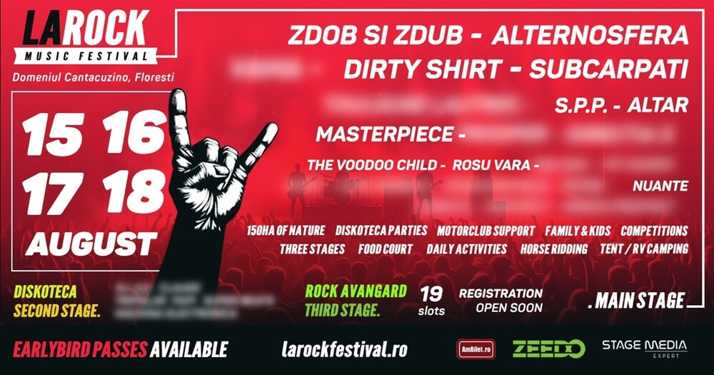 După succesul de anul trecut, LaRock Music Festival revine cu a doua ediție pe Domeniul Cantacuzino de la Florești (Prahova), una care va avea o zi în plus și va fi organizată chiar în minivacanța de Sf. Maria, în perioada 15-18 august.