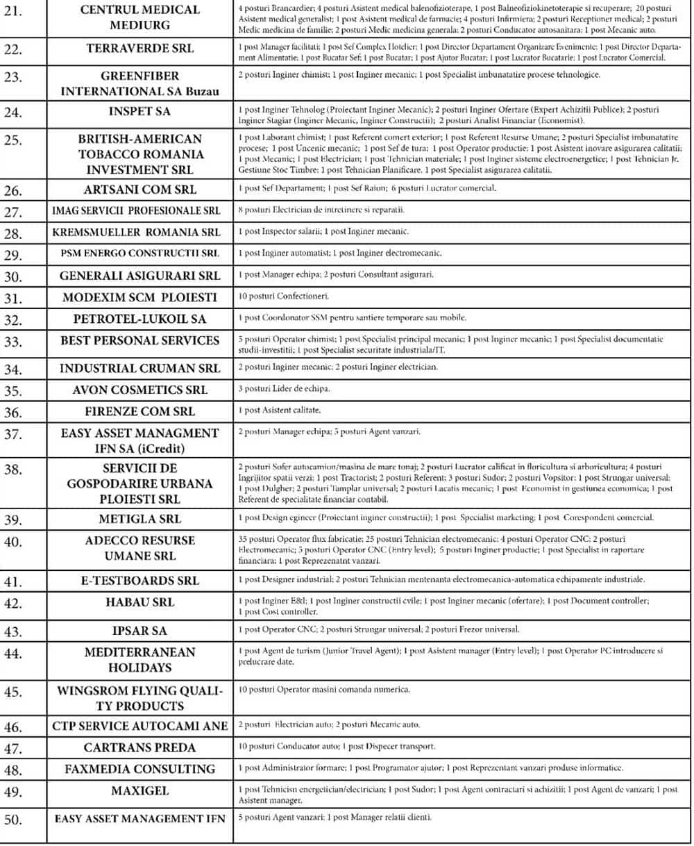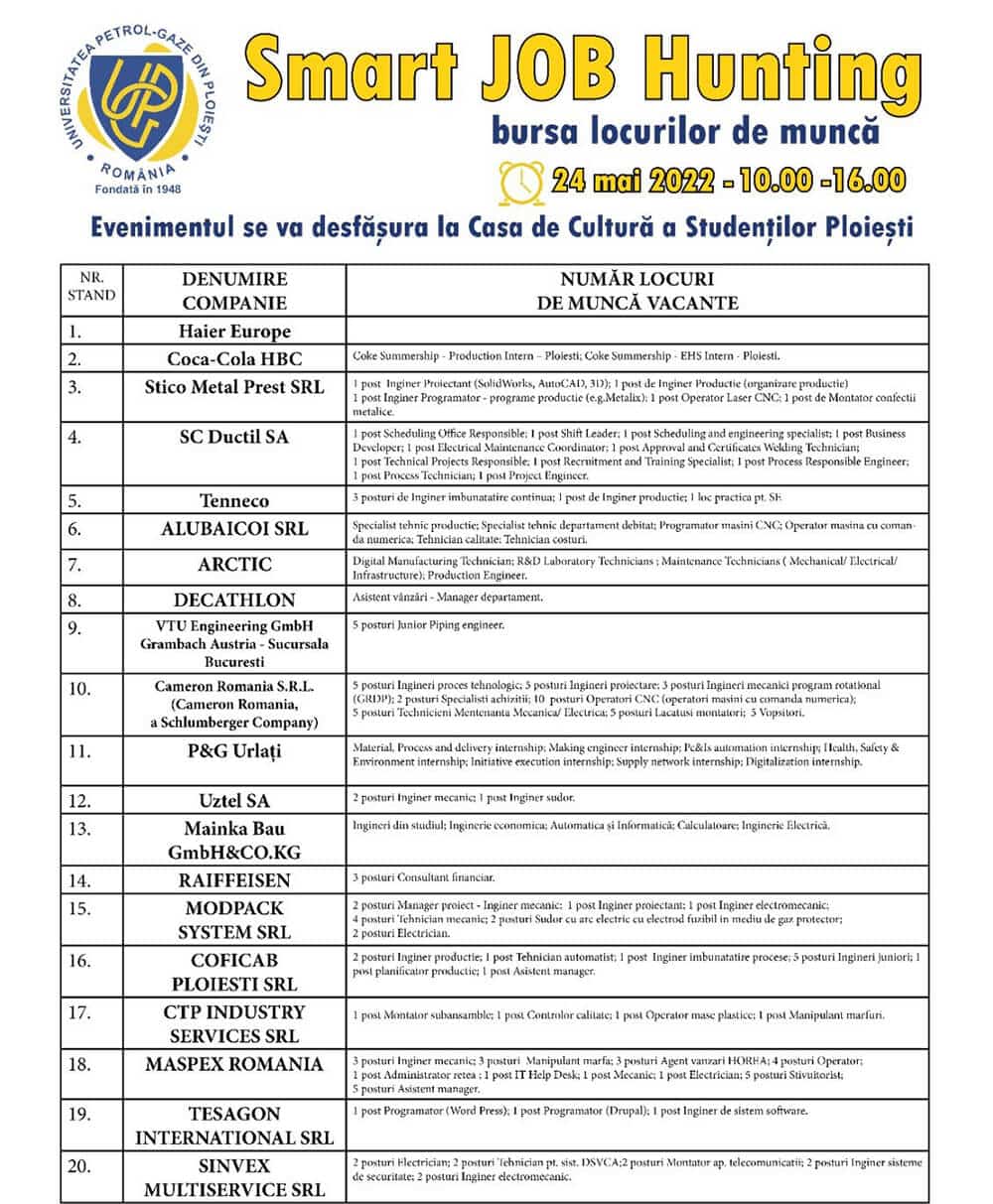 UPG a publicat și lista companiilor care vor fi prezente cu oferte de muncă pentru tineri, precum și posturile vacante anunțate de acestea: