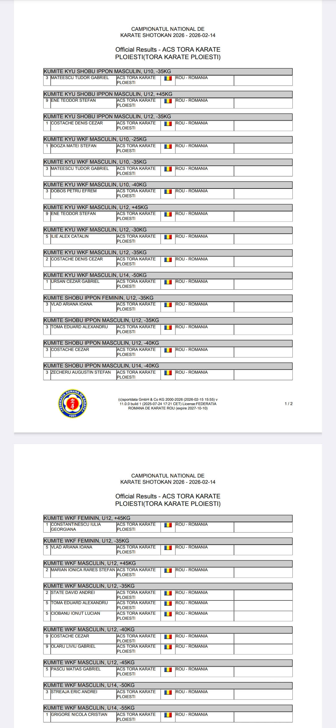 - Avram Vladimir locul 1 kumite shobu nihon masculin Cadeți +70kg, locul 3 kumite wkf masculin Cadeți +70kg, locul 3 kumite echipe Cadeți.
