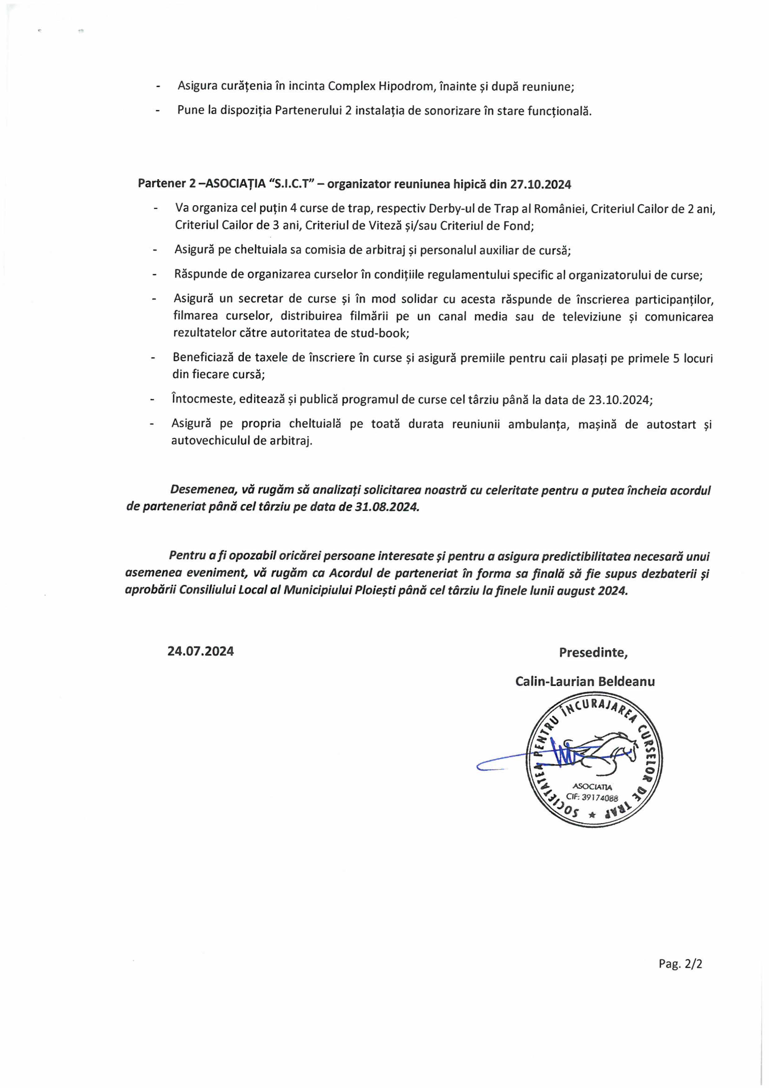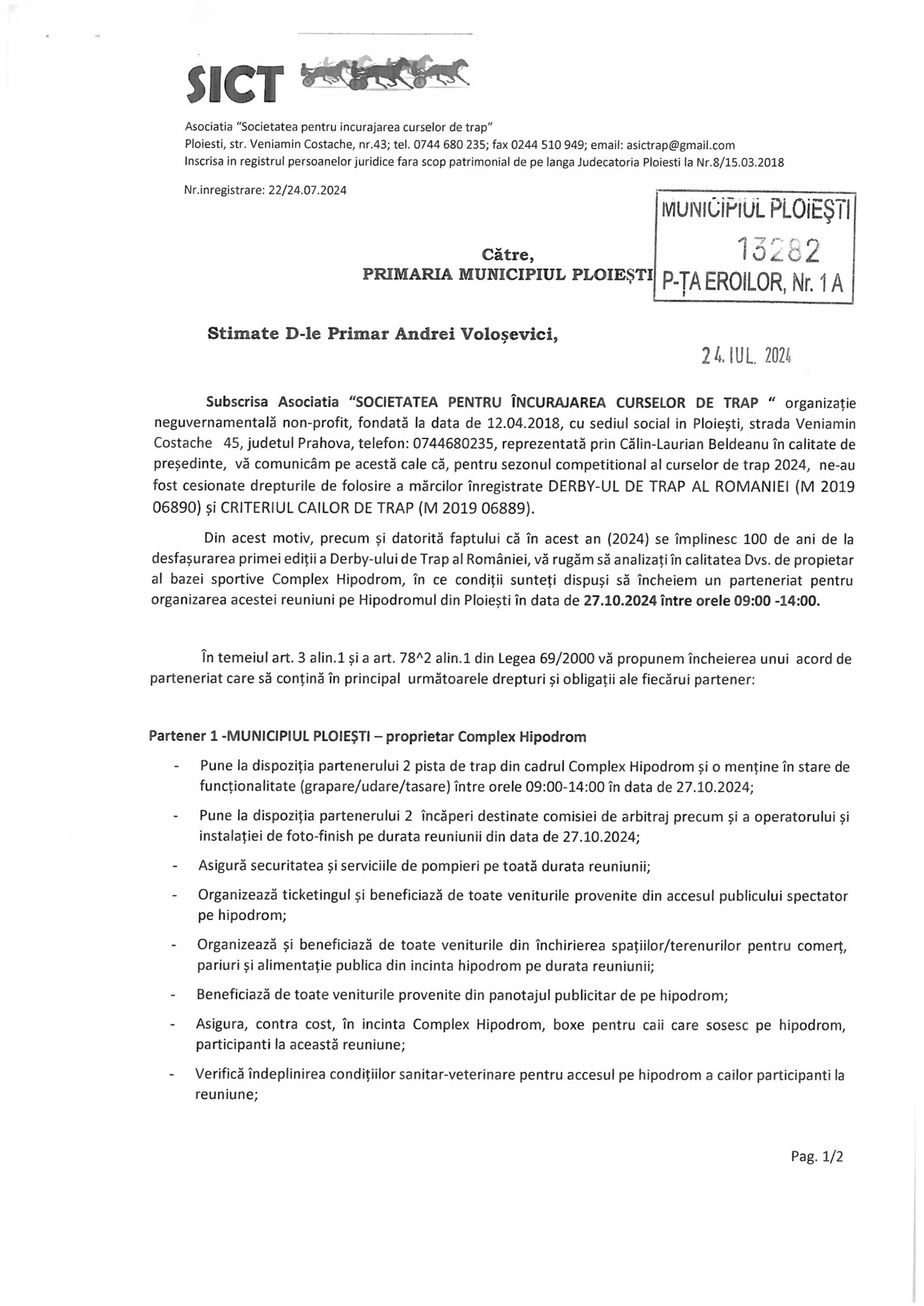 Se apropie data de 24 august când solicitarea Societății pentru Încurajarea Curselor de Trap trebuie să primească un răspuns din partea (încă) primarului Andrei Voloșevici. Se dorește organizarea unei reuniuni hipice la Ploiești în dată de 27 octombrie. În programul întrecerilor ar fi incluse criteriile cailor de 2 și 3 ani, derby-ul de trap pe anul 2024, care s-ar întoarce după un surghiun de trei ani de la Mangalia, acasă, la Ploiești și criteriul de viteză. Toate cheltuielile de organizare vor fi suportate de către Societatea pentru încurajarea curselor de trap, bașca CSM Ploiești va primi toate încasările biletelor de intrare ale turfiștilor. Pe 27 octombrie nu sunt programate curse, iar un asemenea regal hipic ar fi bine primit de către pătimașii turfiști ploiesteni. Pe 1 septembrie se reiau cursele după vacanța de vară, cu un premiu care are o tradiție de 63 de ani, Premiul Municipiului Ploiesti. Vă așteptăm!